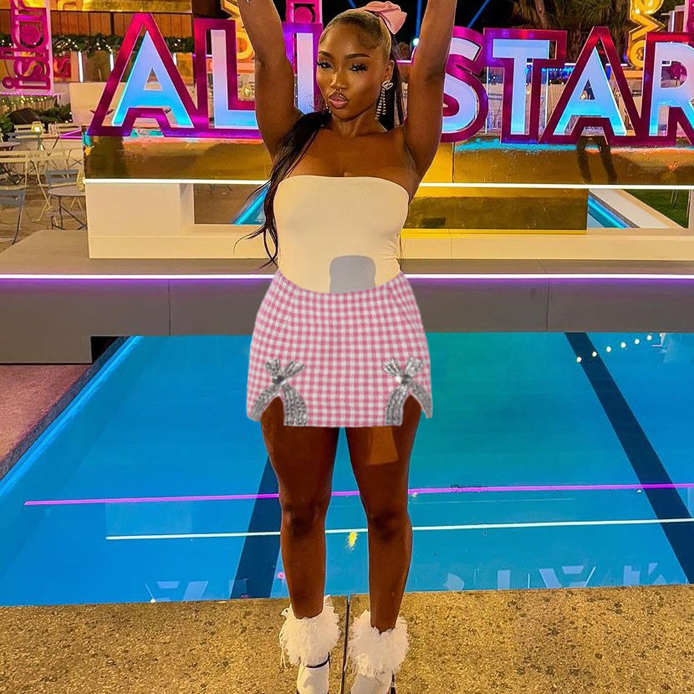 Split Rhinestone Houndstooth European And American Hip Skirt