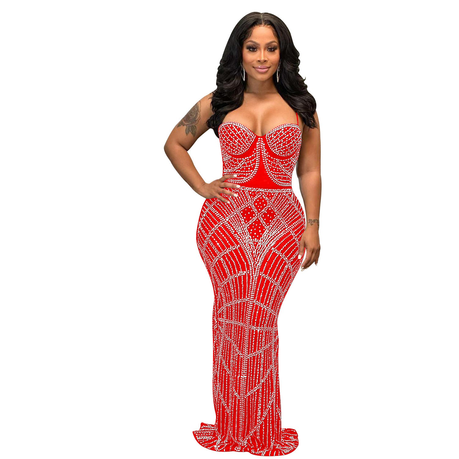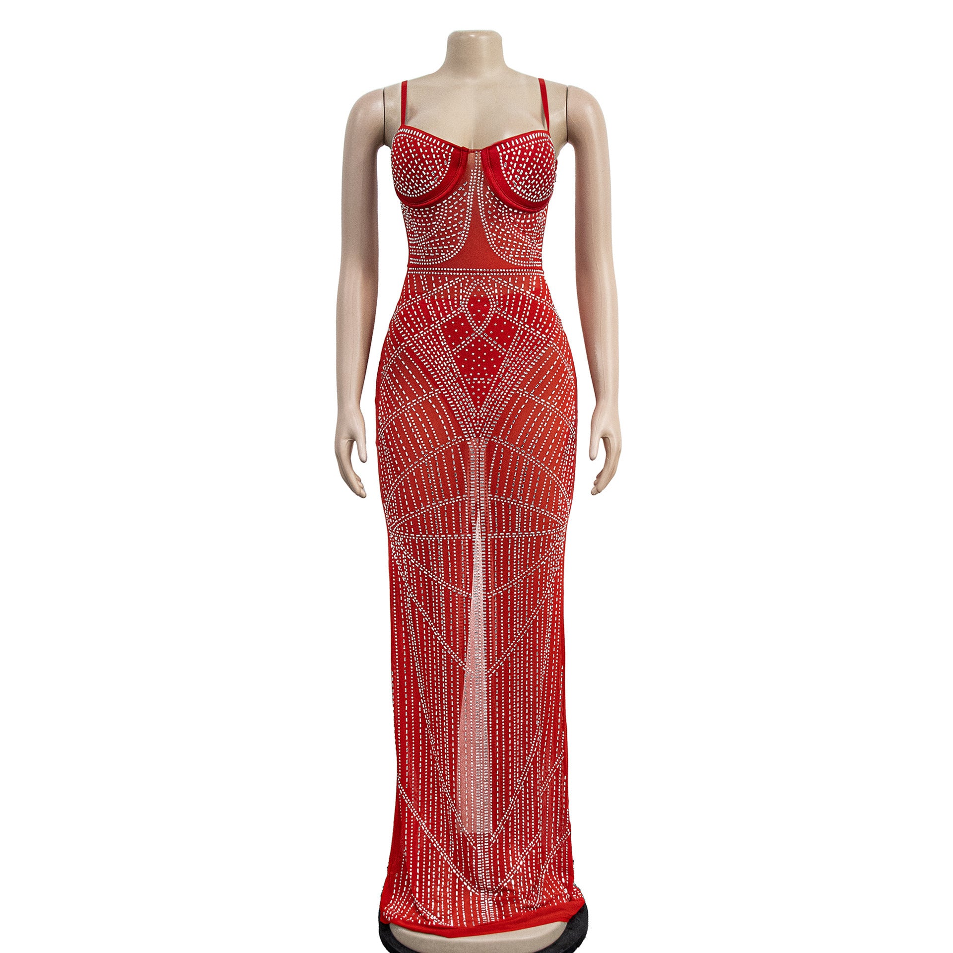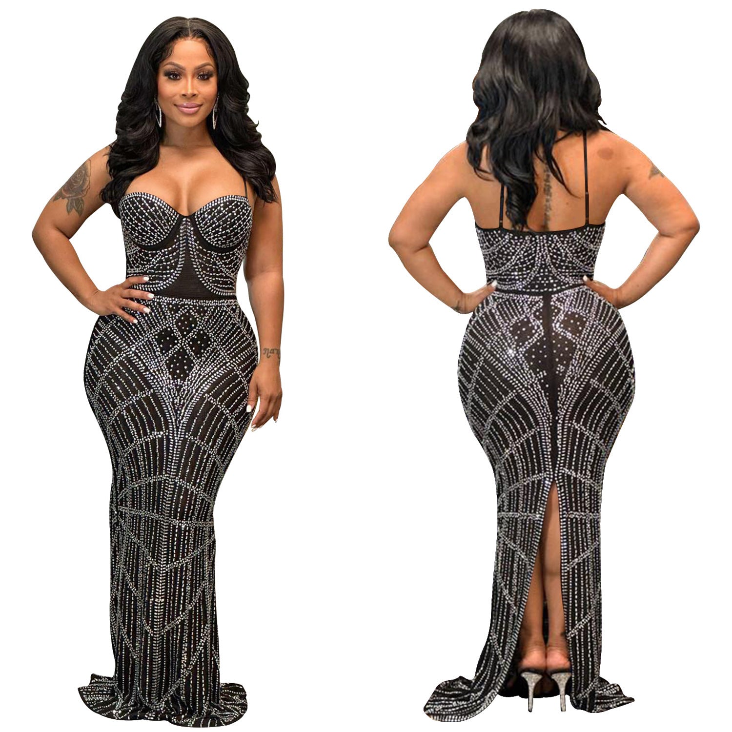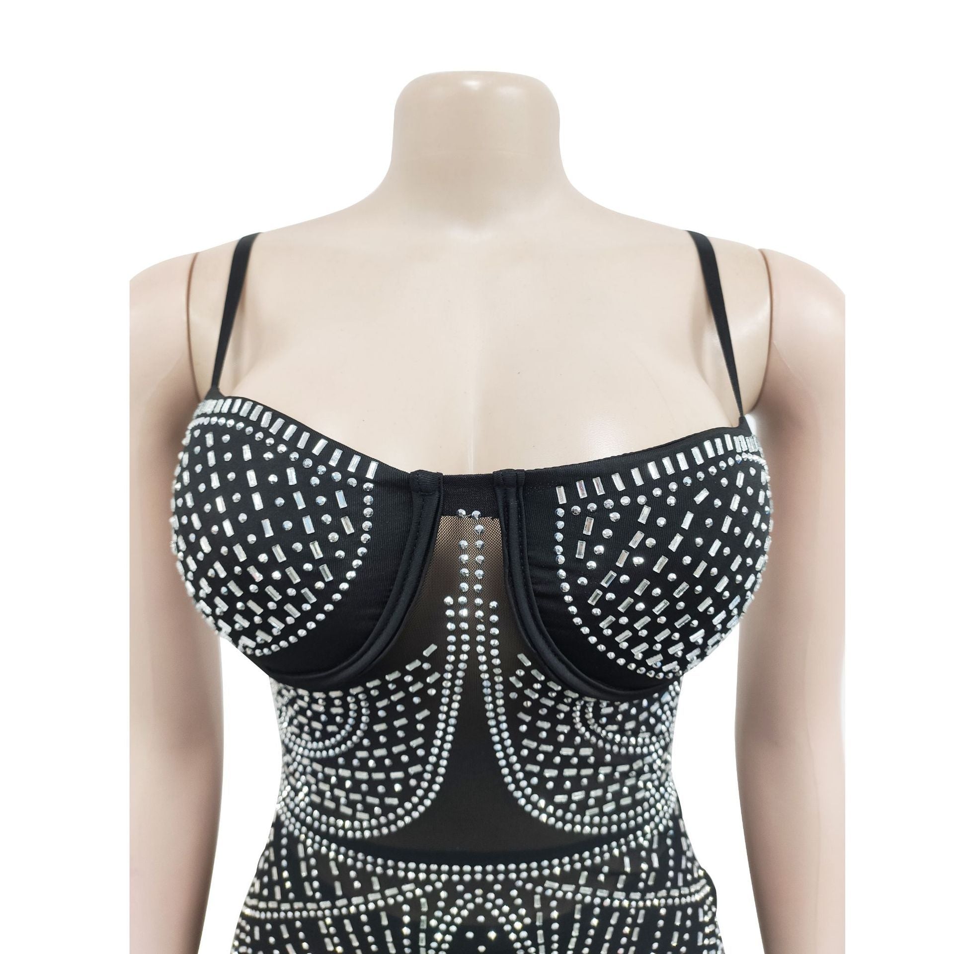 Women's Solid Color Rhinestone Mesh Sleeveless Shoulder Strap Dress
